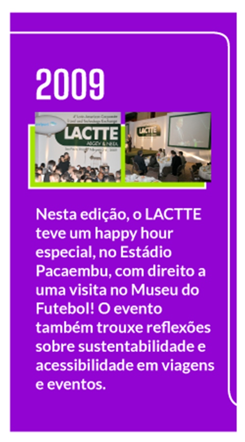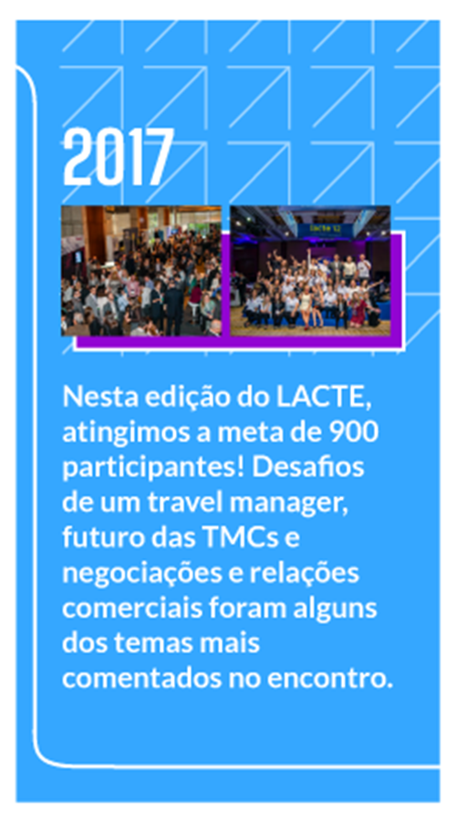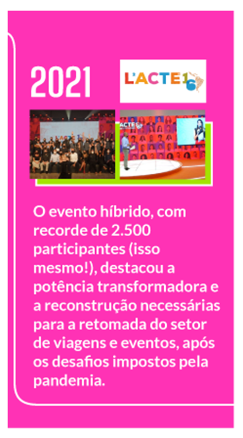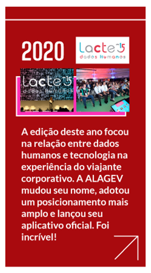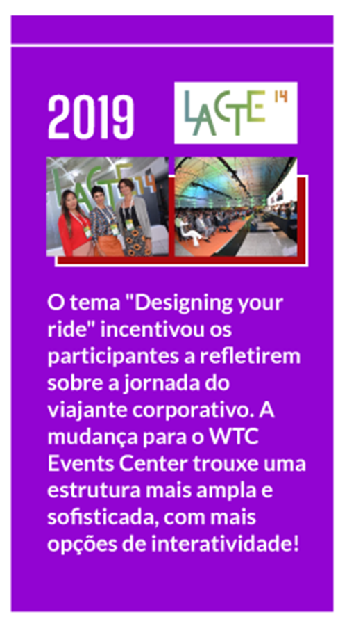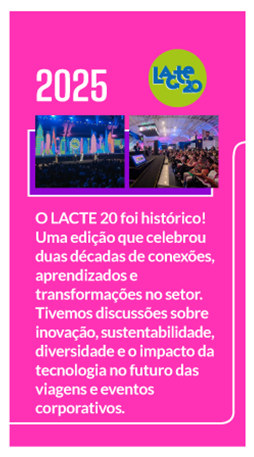 O LACTE (Latin American Community for Travel and Events Experience) é o evento mais relevante do mercado de viagens, eventos e mobilidade corporativa na América Latina, reunindo, ao longo de dois dias, os principais fornecedores, compradores e especialistas do setor. Mais do que um encontro, o LACTE é um catalisador de oportunidades, oferecendo uma plataforma estratégica para aprendizado, troca de experiências e construção de parcerias de alto valor.